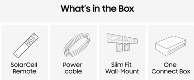 - Samsung One Connect Box. Al hjerne er flyttet væk fra tv'et til en boks med mange tilslutninger. Kun et meget tyndt, gennemsigtigt kabel leverer både el og hdmi til skærmen. Det ser rigtig godt ud, og er helt rigtig tænkt. Tyndt tv, sort, bortgemt boks.